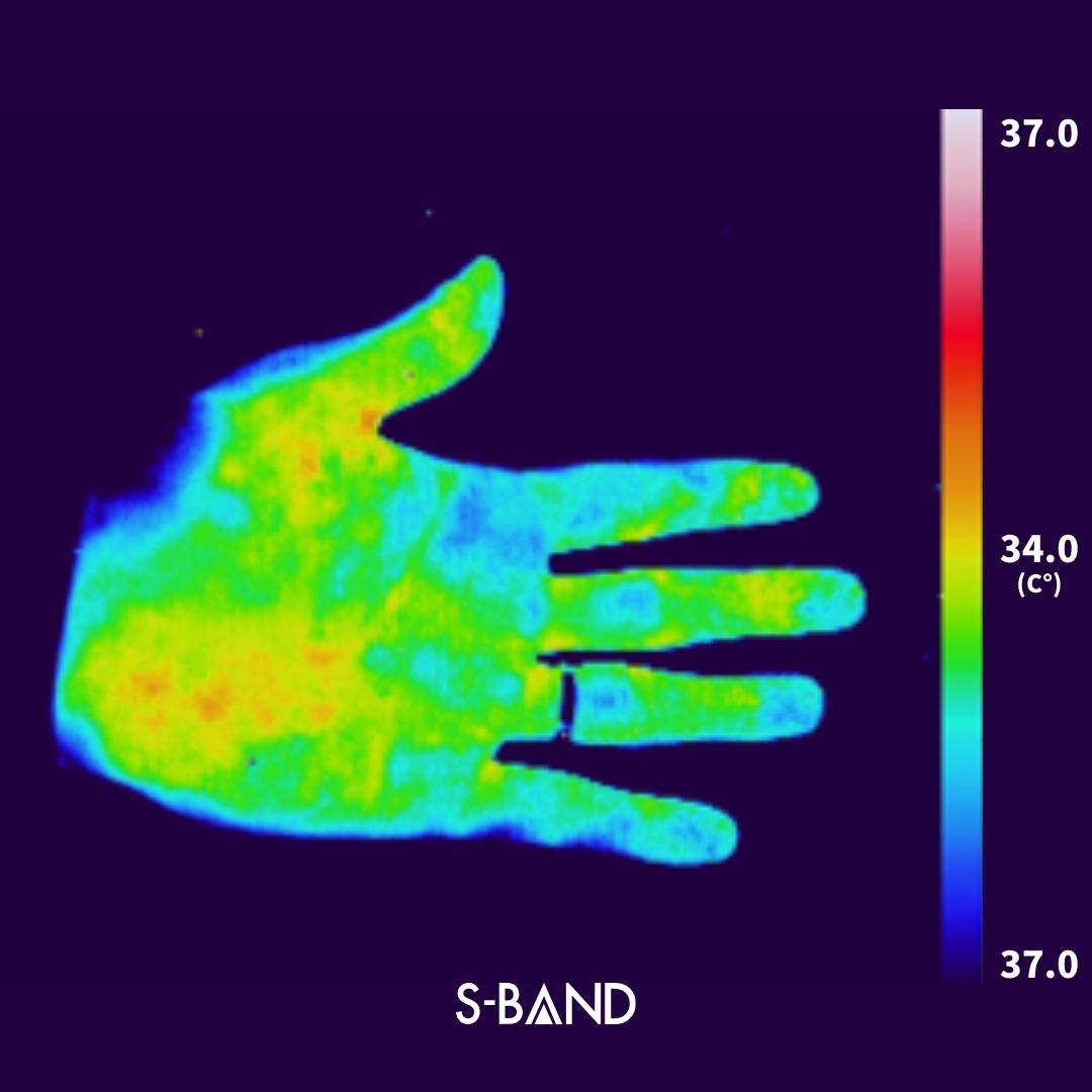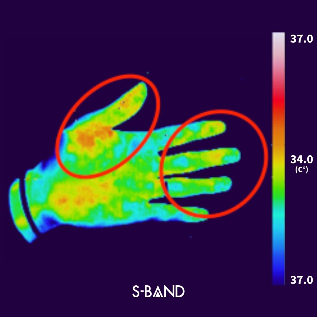 FT™︎技術を適用したブレスレットを手首に着用し、赤外線熱画像処理装置(サーモグラフィー)で手のひらの熱分布を測定したところ、通常のブレスレットに比べて親指の付け根や指先に温度上昇が見られました。(※自社調べ。)